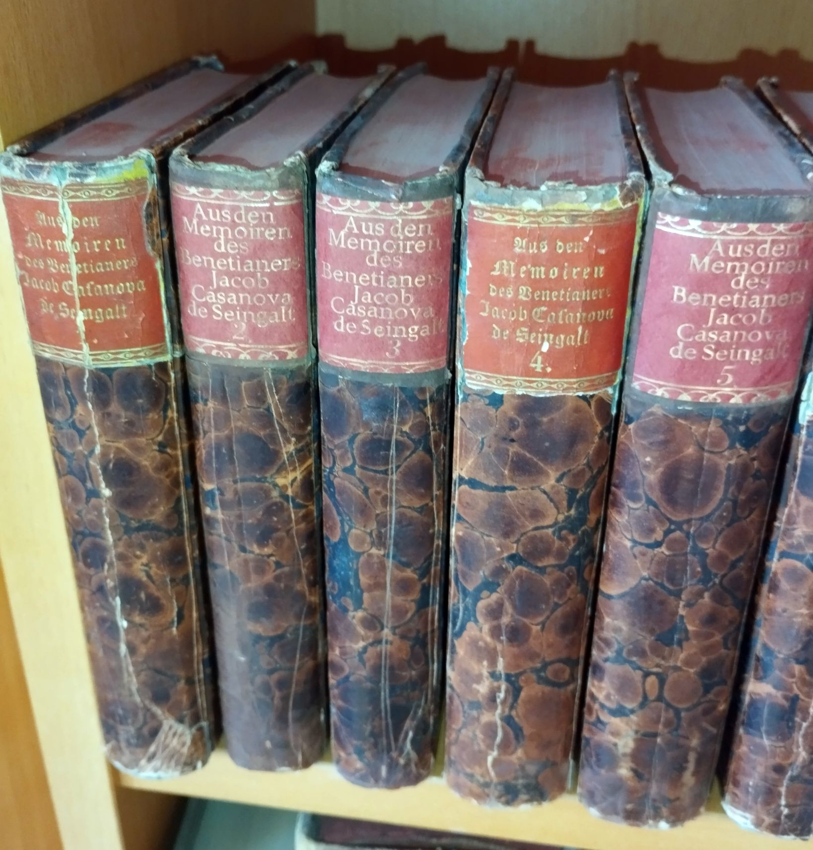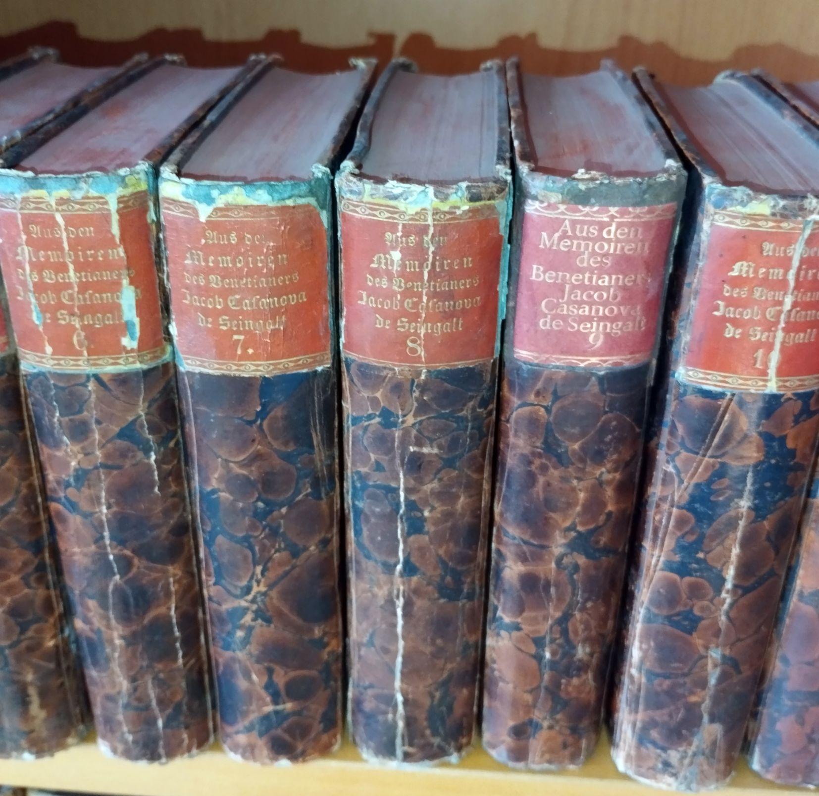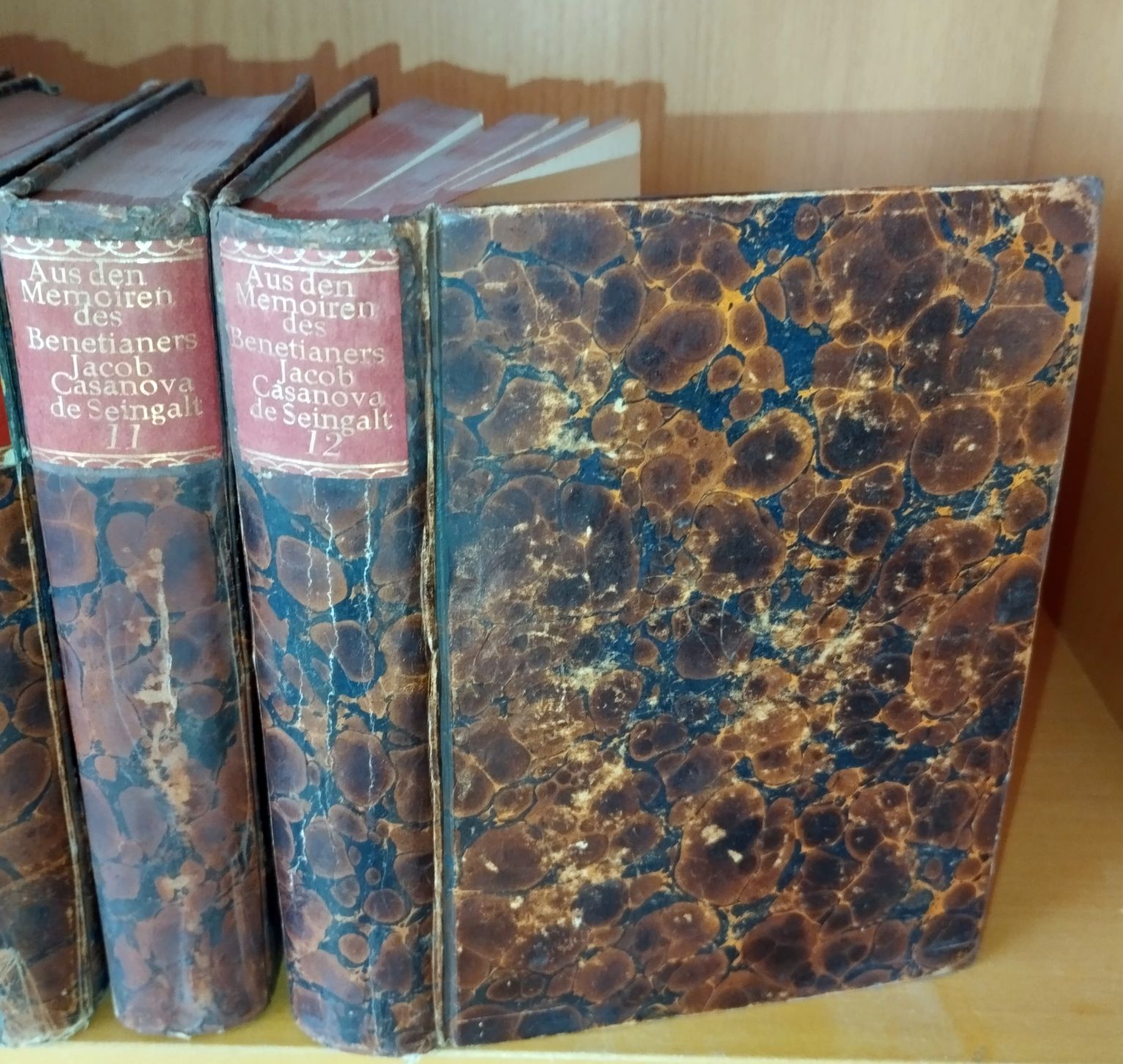 Casanova de Seingalt, (Giacomo Girolamo): Memoiren des Venetianers Jacob Casanova de Seingalt, oder sein Leben, wie er es zu Dux in Böhmen niederschrieb. Nach dem Original-Manuscript bearbeitet von Wilhelm von Schütz. 12 Bände. Leipzig, Brockhaus 1822 – 1828. Marmorierte Pappbände d. Zt. €3800