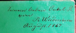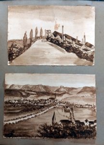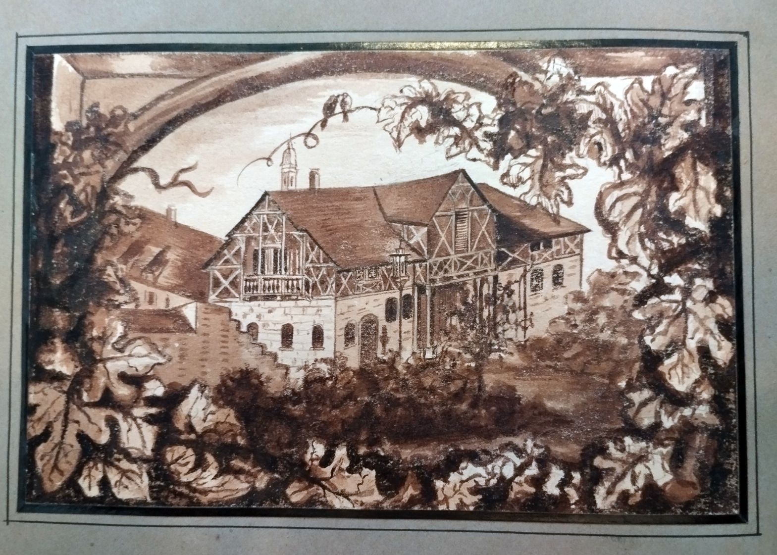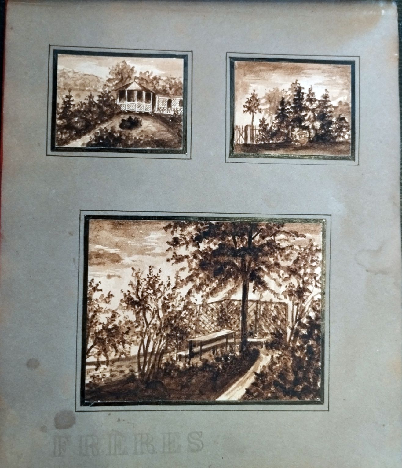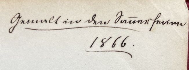 13 Zeichnungen (eine aquarelliert) auf 10 Kartonblättern. Ausgeführt von Robert Wiedersheim. Rote blindgeprägte Lwd. d. Zt. mit goldgeprägten Deckeltitel. 15 x 23,5 cm. Der gebürtige Nürtinger Robert Ernst Eduard Wiedersheim (1848-1923) war ein auf den Gebieten der Zoologie und Anthropologie arbeitender vergleichender Anatom. Seine Mutter, Bertha Friederike Wiedersheim (18251848), geborene Otto, starb wenige Tage nach seiner Geburt. Robert Wiedersheim wurde dann im Haus seines Großvaters, des Fabrikanten Immanuel Friedrich Otto (17911875) in Nürtingen, erzogen. Seine Schulzeit absolvierte er zum einen in Nürtingen und zum anderen in Kirchheim unter Teck dann folgte das Gymnasium in Stuttgart, wo er bei einem Onkel wohnen konnte. Vorliegendes Erinnerungsalbum hat ein handschriftl. Widmung „Meinem lieben Onkel R. von R. Wiedersheim August 1867“ auf dem fliegenden Vorsatz. Des Weiteren ein Eintrag „Gemalt in den Sommerferien 1866“. – Die gekonnt ausgeführten Zeichnungen zeigen wohl die großelterliche Villa, mehrere Fabrikgebäude des Baumwollindustriellen Otto und einige kleine romantische Ansichten. Die Zeichnungen im Format 12 x 17 cm (7) und kleiner. – Etwas bestoßen. Leicht gelockert, die Zeichnungen selbst tadellos.