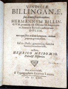 VD17 23:233738C. – Meibom versucht zu beweisen, dass Hermann Billung (Herzog von Sachsen im 10. Jahrhundert) nicht – wie in einigen Legenden behauptet – der Sohn eines armen Bauern war. Die Schrift dient als „offensichtlicher Beweis“ (demonstratio evidens), dass er aus einem illustren sächsischen Adelsgeschlecht stammte. Das Werk sollte die Legitimität und den hohen Status des Hauses Billung untermauern. – Der Holzschnitt zeigt Hermann Billung und seine vermeintliche Ehefrau (tatsächlich Schwiegertochter) Hildegard von der Westerburg. – Titelblatt gebräunt.