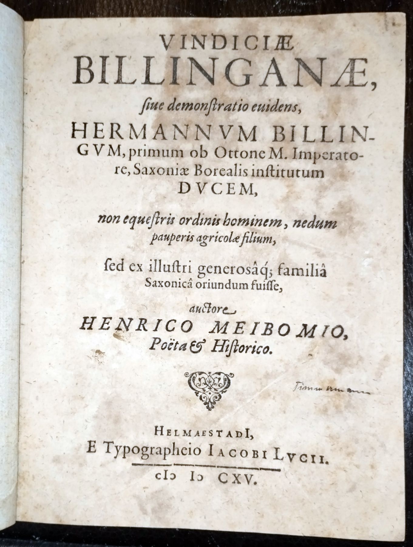 Meibom, Heinrich: Vindiciae Billinganae, sive demonstratio evidens, Hermannum Billingum, primum ob Ottone M. Imperatore, Saxoniae Borealis institutum Ducem, non equestris ordinis hominem, nedum pauperis agricolae filium, sed ex illustri generosaq[ue] familia Saxonica oriundum fuisse. Helmstaedt, Lucius 1615. Mit blattgr. Holzschnitt. 4 Bll., 32 S. Alter Umschlag aus Marmorpapier. 17,5 x 14 cm. €300